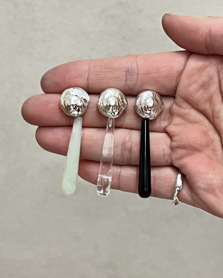 Una concha para recordar el mar del verano y una lágrima de serpentina (verde claro), cuarzo transparente u ónix con movimiento que la acompaña.